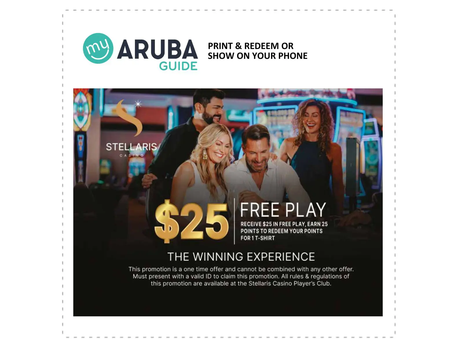 Stellaris Casino offers over 400 the latest and popular slot machines where you can enjoy your nights on Aruba. Present or show this coupon to redeem $25 in free play, earn 25 points to redeem your points for 1 T-shirt.