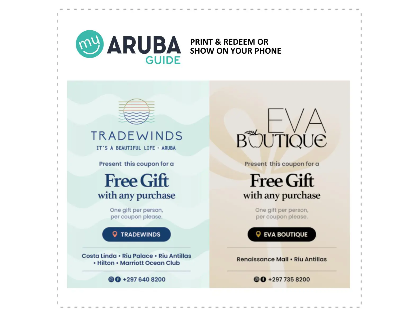 TradeWinds Aruba ofrece moda elegante y exclusiva, incluyendo ropa, calzado, trajes de baño, accesorios y regalos únicos. Una parada perfecta para renovar tu vestuario de vacaciones o encontrar algo especial para llevarte a casa. Visita una de sus tiendas en Costa Linda, Hilton Aruba, Riu Antillas, The Mill o Marriott Ocean Club. Presenta este cupón para recibir un regalo gratis con cualquier compra: un regalo por persona y por cupón.